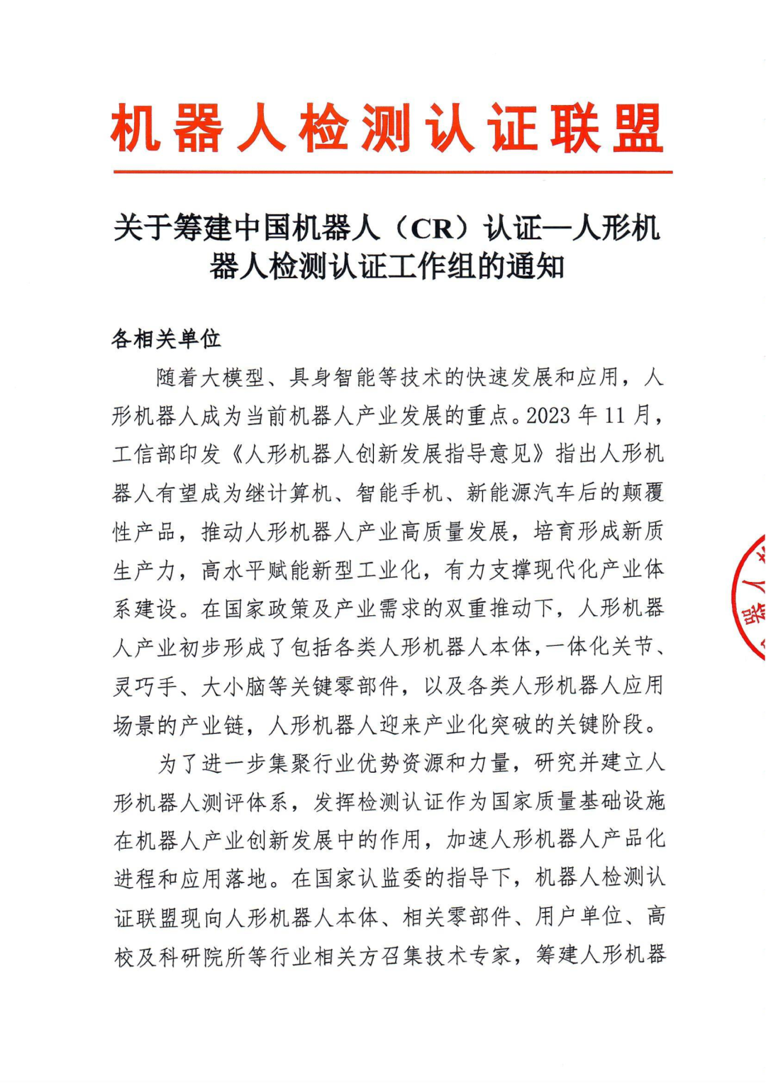 关于筹建中国机器人(CR)认证——人形机器人检测认证工作组的通知