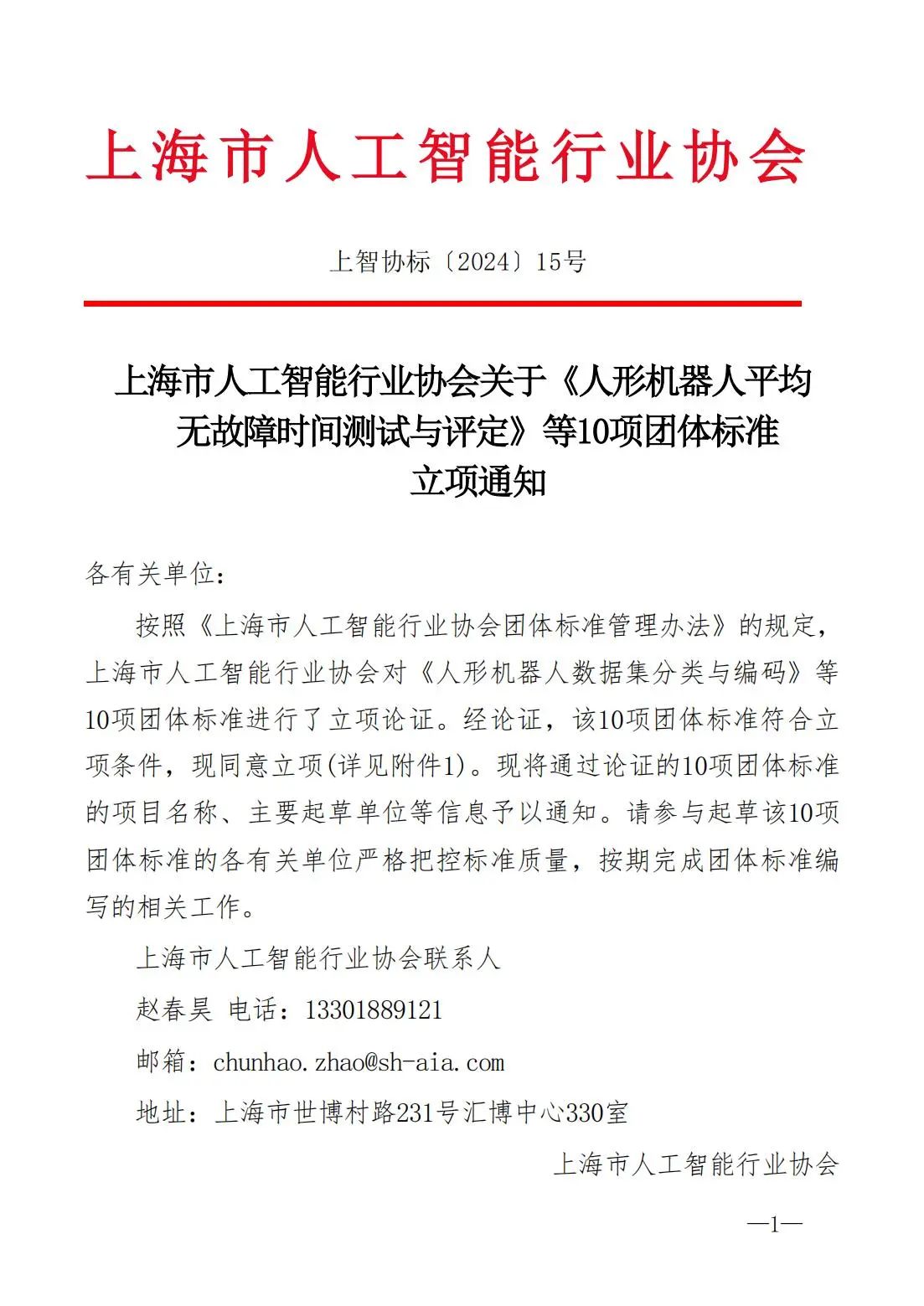 2024年11月12日上智协标〔2024〕15号,上海市人工智能行业协会下达了关于《人形机器人平均无故障时间测试与评定》等10项团体标准立项通知。