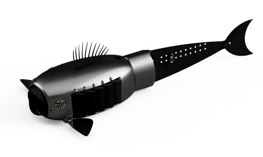 通过拍打尾巴、摆动鱼鳍来游泳,尾部是由连接到尾巴底部的电动推杆驱动的,左右鱼鳍由单独的电机驱动,二者通过改变左右电机的相对振幅来转向。