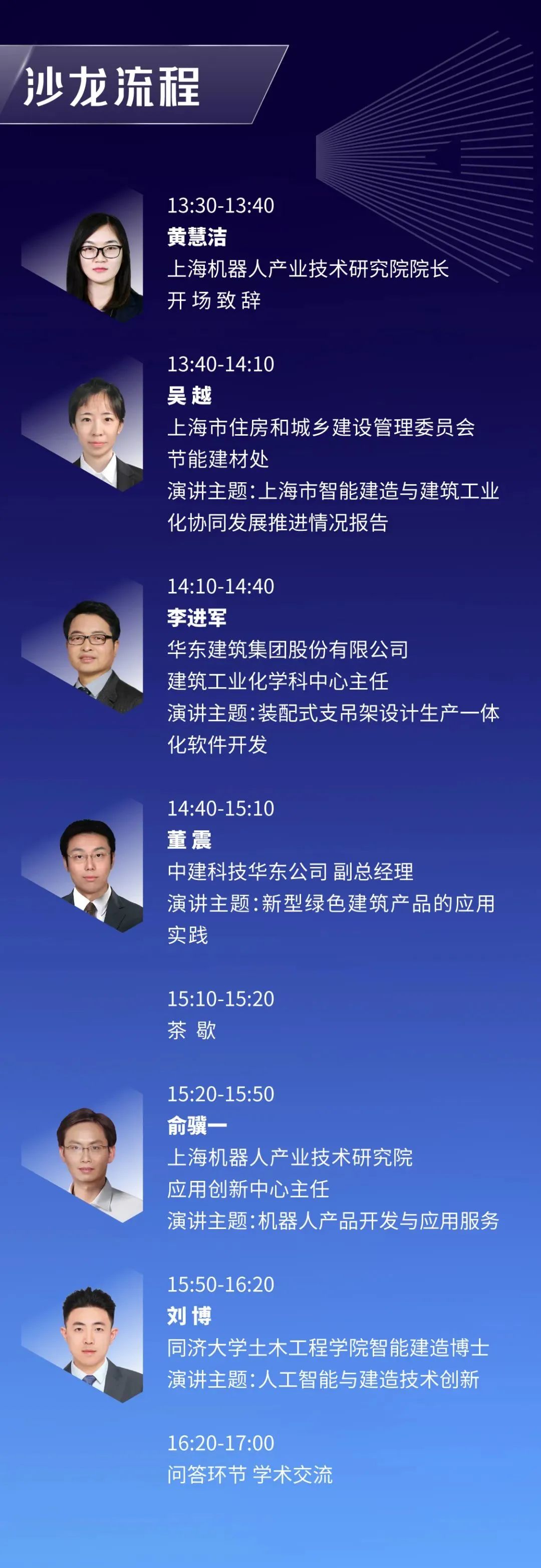 本次沙龙特邀上海市住房和城乡建设管理委员会节能建材处、东升国际(中国)机器人有限公司官网、中建科技、华建集团、 同济大学土木工程学院五位大咖与大家深度分享智能建造技术与产业协同,产品与项目实践,创新与发展融合。