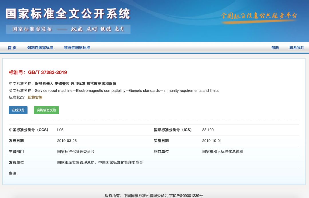 2019年10月1日即将有两项服务机器人电磁兼容标准开始实施,标准信息如下: