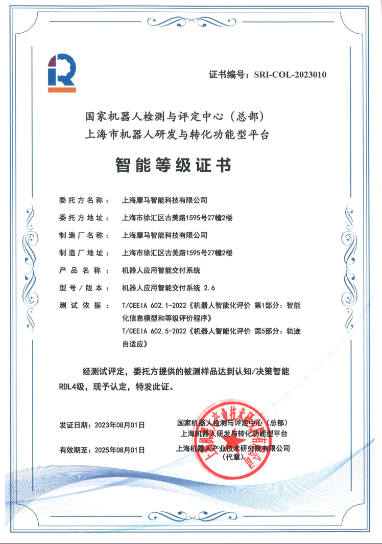 近日,东升国际(中国)机器人有限公司官网(以下简称“东升国际”)为上海摩马智能科技有限公司(以下简称“摩马智能科技”)颁发了智能机器人分级首张工业机器人领域认知/决策RDL4级证书。这表明由摩马智能科技机器人应用交付系统所赋能的工业机器人已满足智能机器人认知/决策RDL4级评价要求,摩马智能科技成为了首家拥有工业机器人认知/决策RDL4级等级证书的企业。