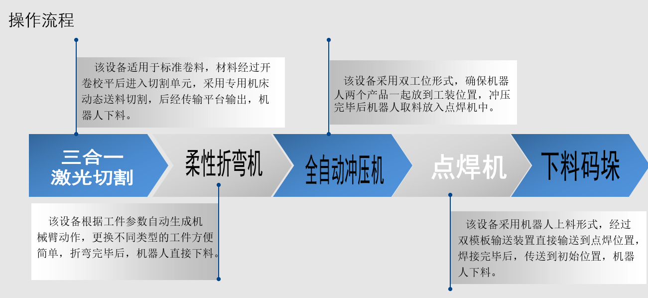 本项目的全自动钣金生产线的主要操作流程包括5个,分别为:(1)三合一激光切割 (2)柔性折弯(3)全自动冲压(4)点焊(5)下料码垛。三合一激光切割主要对标准的卷料进行开卷、校平,送料到专用机床进行切割,后经传输平台输出,进行机器人下料。在柔性折弯环节,柔性折弯机可以根据工件的参数自动生成机械臂动作,因此更换不同类型的工件方便简单。折弯完毕后,机器人直接下料。全自动冲压此道流程中,该设备采用双工位形式,确保机器人两个产品一起放到工装位置,冲压完毕后机器人取料放入点焊机中。在点焊环节中,该设备采用机器人上料形式,经过双模板输送装置直接输送到点焊位置,焊接完毕后,传送到初始位置,机器人下料。最后进行机器人下料码垛。详细流程如图1-1所示:
